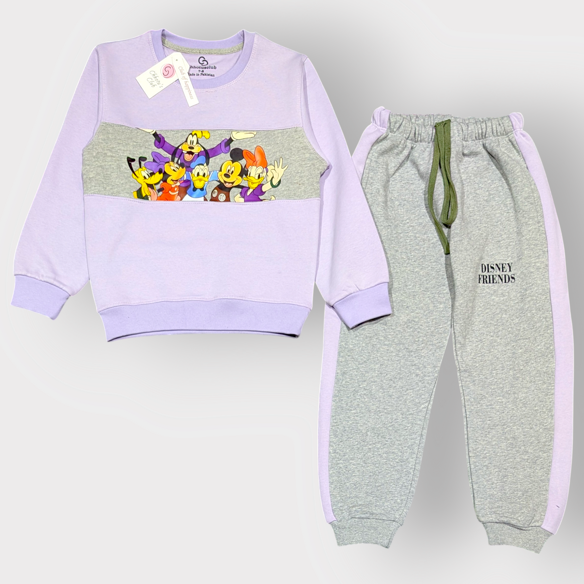 Bring the magic of friendship to your child's wardrobe with this adorable Disney Friends 2-piece set! The lavender and grey sweatshirt features beloved characters like Mickey, Minnie, Donald, and Goofy, while the matching joggers have a comfy fit with "Disney Friends" printed on the leg. Perfect for playtime, lounging, or fun outings—crafted from soft, cozy fabric for all-day comfort.