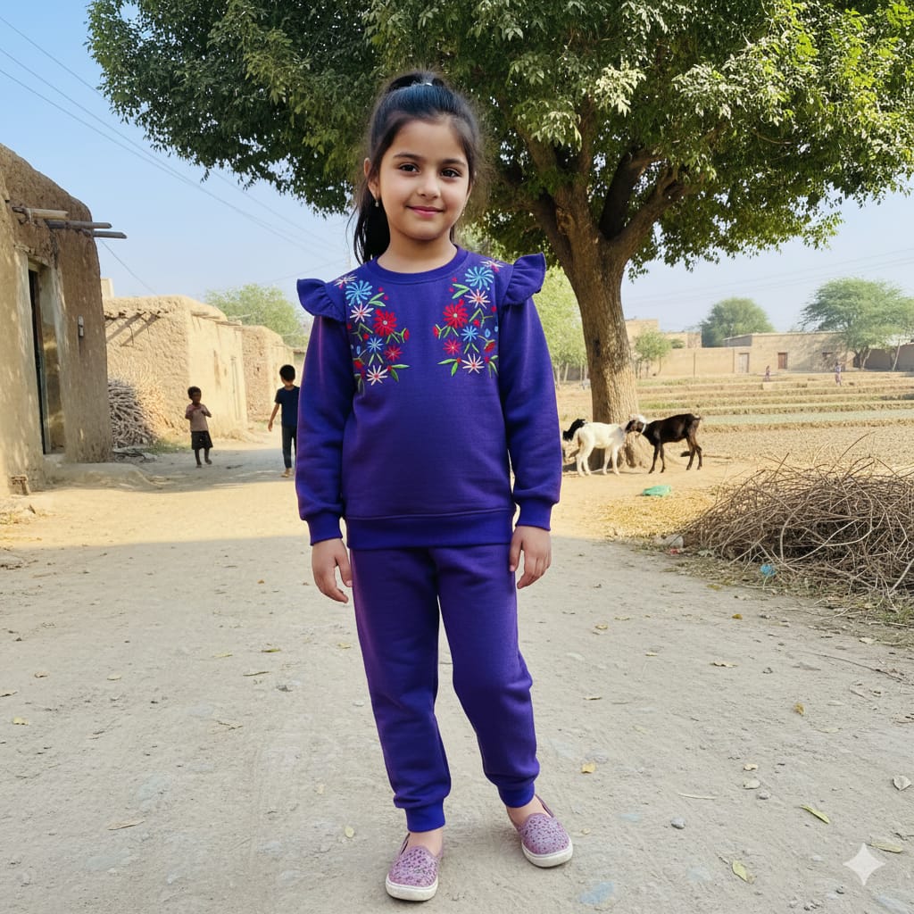 Soft mint tracksuit with colorful floral embroidery and ruffle sleeves — perfect blend of comfort, charm, and everyday style for kids.