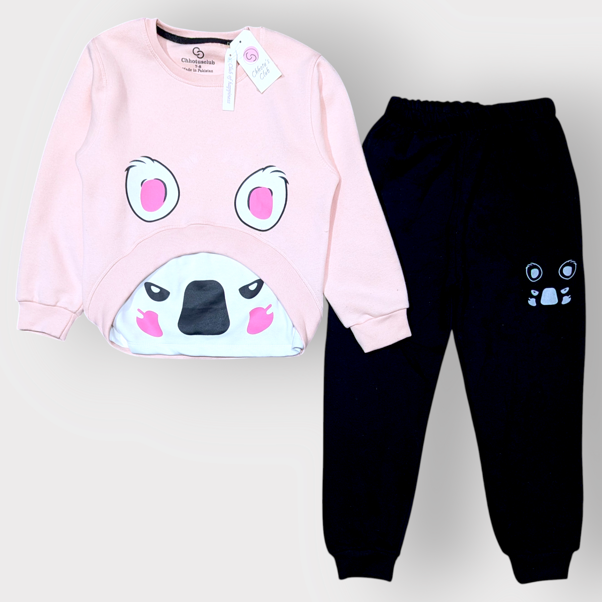 This charming two-piece set features a soft pink sweatshirt with an adorable animal face design and playful eyes, paired with black jogger pants decorated with a matching mini face graphic. Perfect for fun and cozy everyday wear!