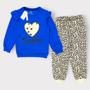 Keep your little one cozy and stylish with this adorable two-piece outfit! The set features a bright blue sweatshirt with cute ruffle sleeves and a heart design that reads “Daughter.” Paired with soft, leopard print jogger pants, this outfit is perfect for playtime or casual outings. Made from comfortable, breathable fabric, it’s designed for all-day wear and easy movement.