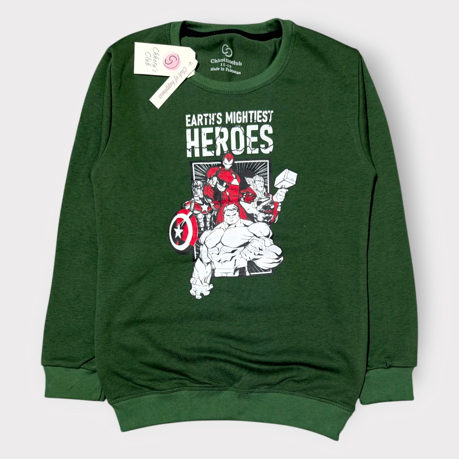 A bold and comfy forest-green sweatshirt featuring a dynamic superhero-themed graphic. Perfect for little fans who love action, adventure, and heroic style.