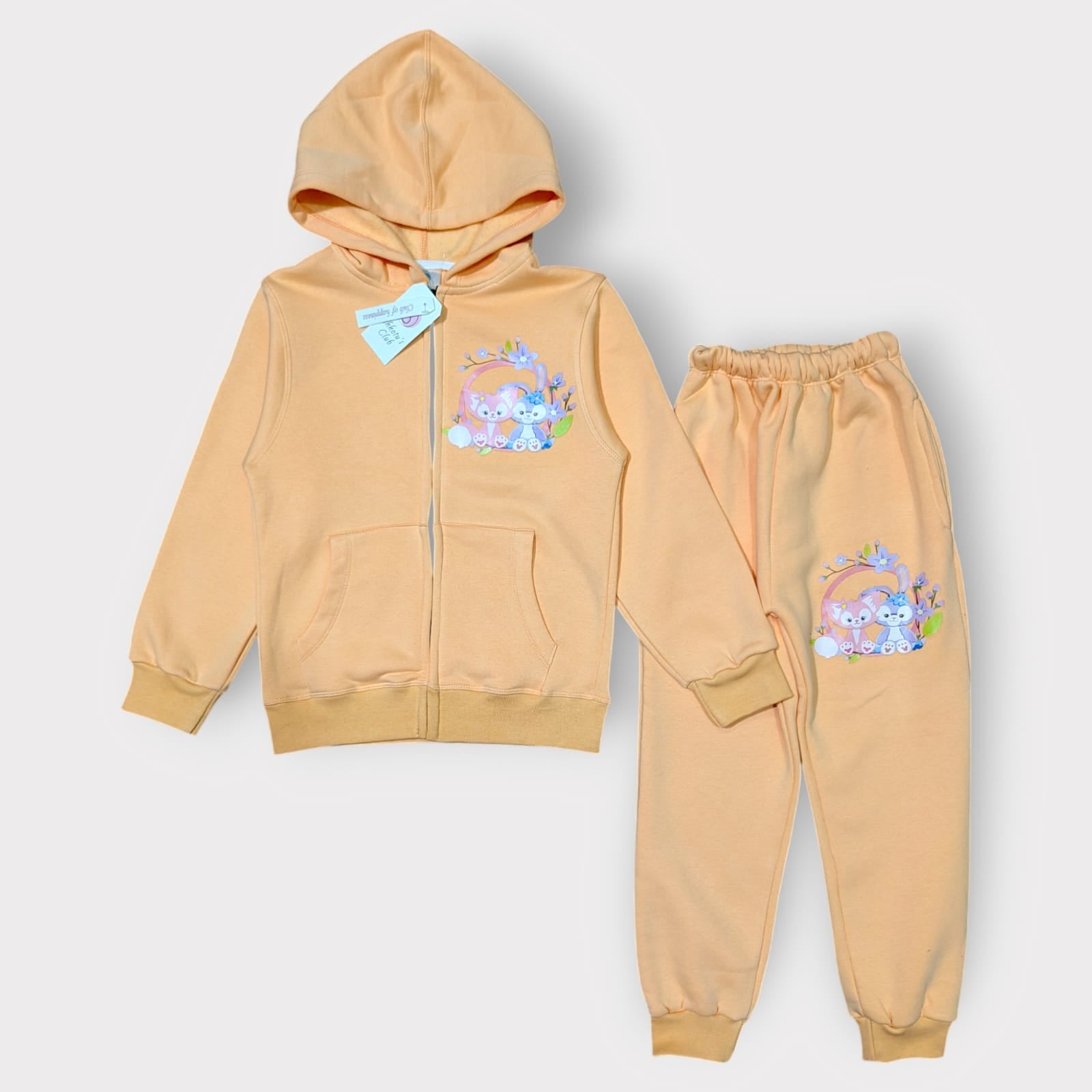 This cozy kids’ tracksuit set includes a soft peach zip-up hoodie and matching jogger pants, both featuring an adorable animal graphic. Made from comfortable, breathable fabric with ribbed cuffs and roomy pockets, it’s perfect for everyday wear, playtime, or outings. A cute and comfy choice your child will love!