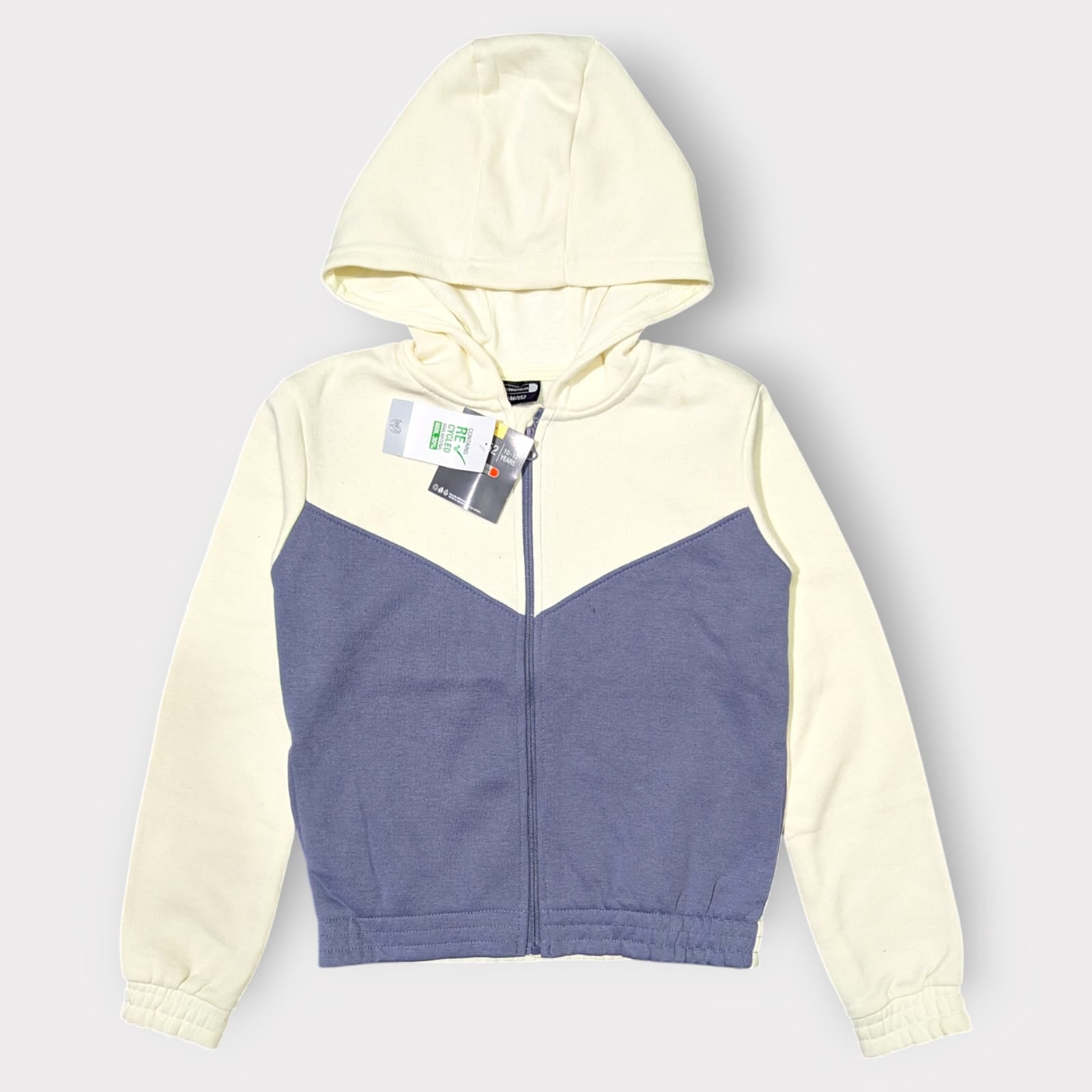 Keep your little one cozy and stylish with this soft, two-tone zip-up hoodie. Featuring a cream top and sleeves paired with a slate-blue body, it offers a modern color-block look perfect for everyday wear. The hood adds extra warmth, while the elastic hem and cuffs ensure a comfy fit. Ideal for school, play, or casual outings.
